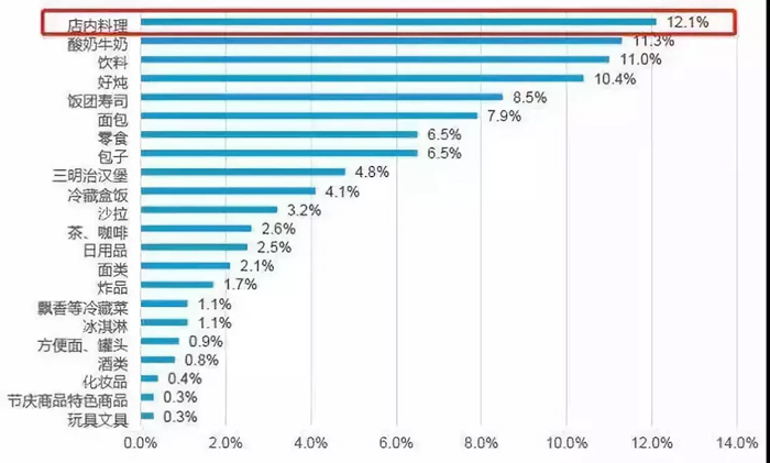 相比較而言,國內(nèi)消費者對于鮮食有著更寬容的心態(tài)。據(jù)調(diào)查,12.1%的消費者進便利店會購買店內(nèi)料理,再算上關(guān)東煮10.4%,飯團壽司8.5%、包子、三明治等鮮食的購買比例,總體數(shù)據(jù)側(cè)面反映了中國消費者對鮮食相對信任的態(tài)度。