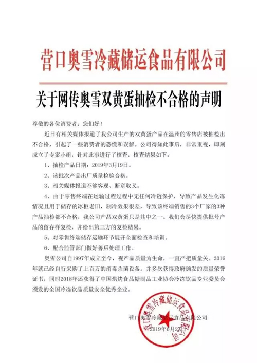 6月27日深夜,奧雪冰淇淋在其官方微博緊急回應稱,該批次產品出廠質量檢驗合格,由于零售終端在運輸過程中無任何冷鏈保護,導致產品發生化凍情況,將配合監管部門做好善后處理工作。